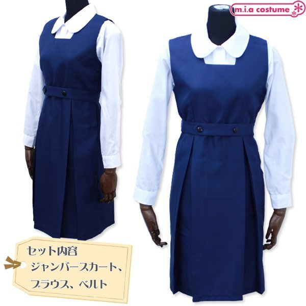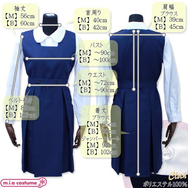 サイズ/ セット内容 | BIGサイズ:B〜100cm・W〜90cm・ブラウス着丈80cm・ジャンパースカート丈102cm・袖丈60cm・肩幅45cm・首周り42cm・ベルト106cm セット内容:ブラウス(前ボタン)、ジャンバースカート(裏地有り・脇と肩スナップボタン留め)、ベルト 素材:ポリエステル100% |